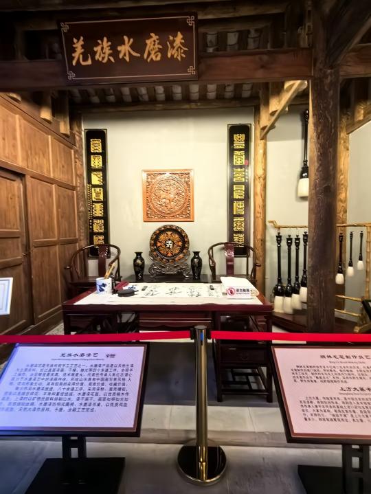 随后,实践队员来到“羌族水磨漆器”展区。羌族水磨漆器,作为羌族文化中的瑰宝,其制作过程凝聚了无数匠人的智慧与汗水。从最初的打坯塑形,到精细的褙布上灰,再到繁复的水磨、上漆、绘制与抛光,整个过程竟有近八十道工序之多,每一步都如同精心雕琢的艺术品,承载着匠人对美的极致追求。展柜中,一件件精美的漆器作品熠熠生辉,它们不仅是有着实用的功能的器具,更是羌族人民智慧与创造力的结晶。那温润细腻的触感、光泽如镜的表面,无不透露出匠人们对艺术的深刻理解。