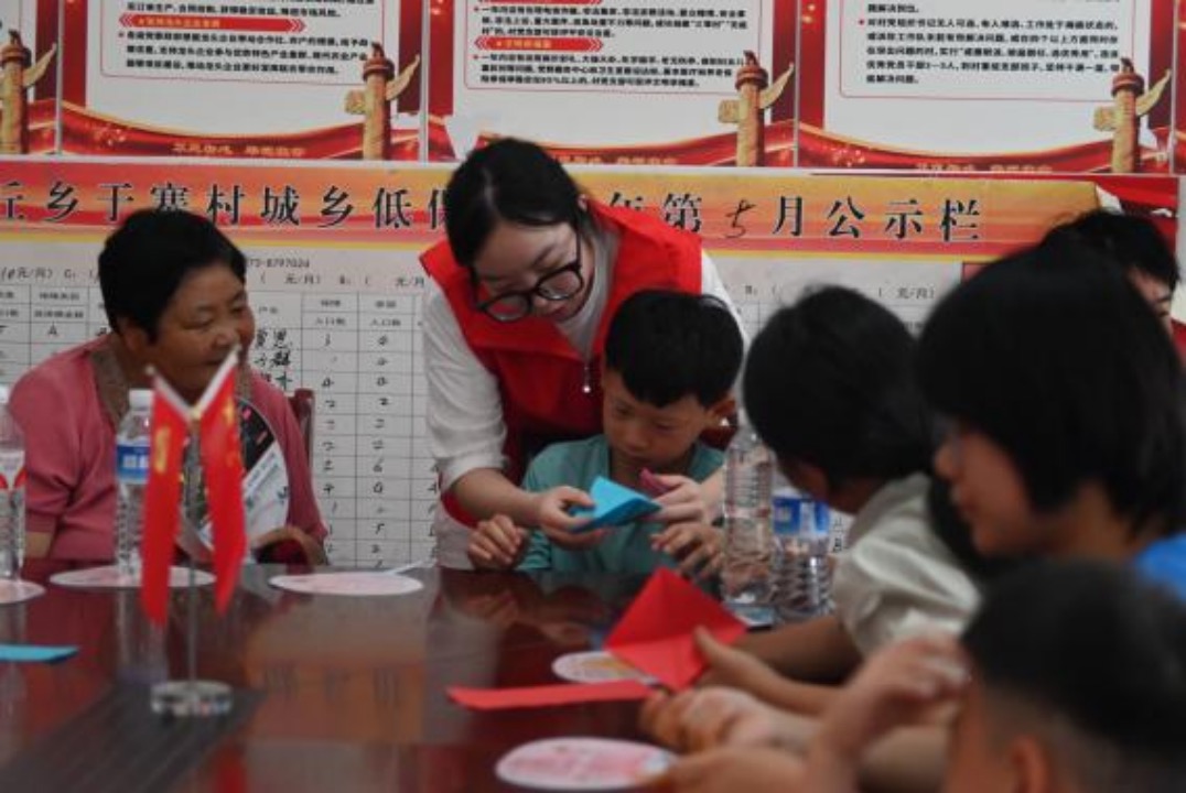 在村委的会议厅中,另一支小队精心策划了一场别开生面的破冰活动,旨在打破初见的陌生感,促进队员与当地孩子们之间的友好交流。他们选择了折纸活动,这种简单却富有创意的游戏瞬间点燃了孩子们的好奇心和参与热情。队员们耐心地指导孩子们折叠出一只只栩栩如生的纸鹤、纸船等,每个步骤都充满了欢声笑语。随着一张张彩纸在手中变幻,不仅是技巧上的传授,更是心灵上的触碰。孩子们与队员分享着各自的小秘密和梦想,兴趣与爱好在轻松愉快的氛围中自然流露,构筑了一道道无形的心灵桥梁。
