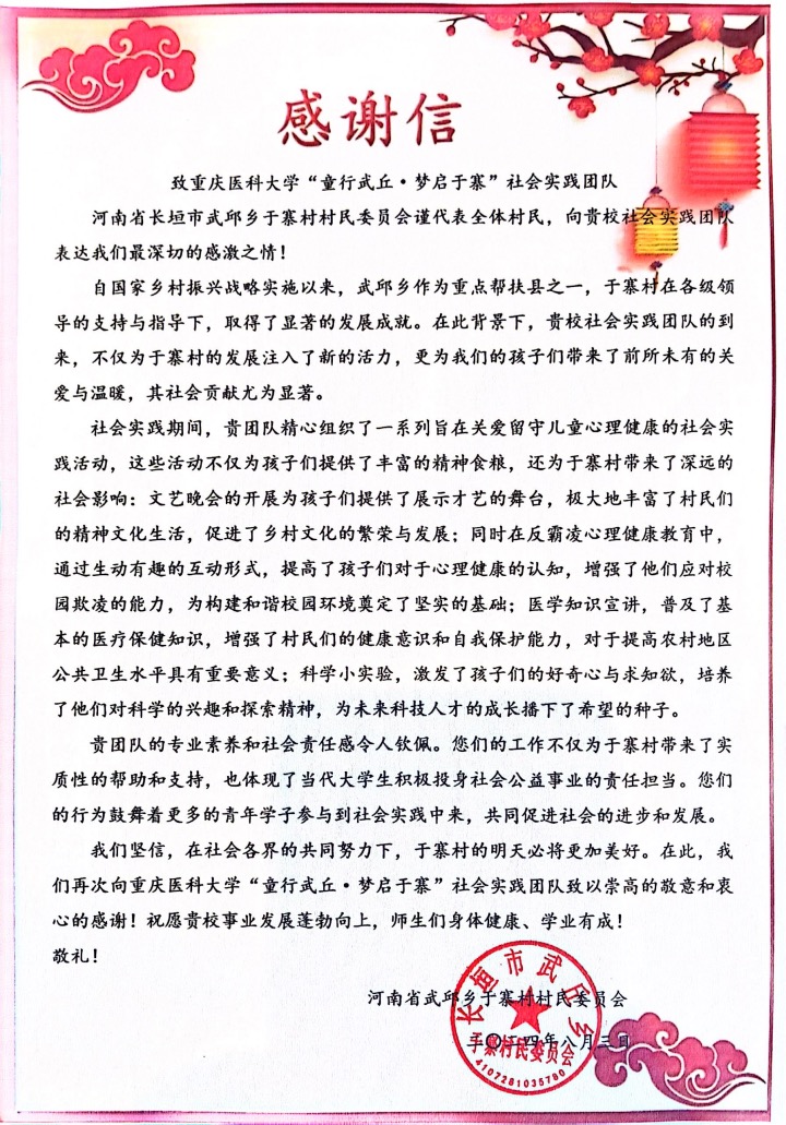 于寨村村委会以一封情感真挚的感谢信,表达了对"童行武丘·梦启于寨"社会实践团队最深的敬意。信件中的每一句话都满载着对团队辛勤付出的认可与赞赏,以及对未来合作的殷切期望。此外,特别感谢于寨村的于书记,他的全力支持为活动的成功奠定了坚实的基础。