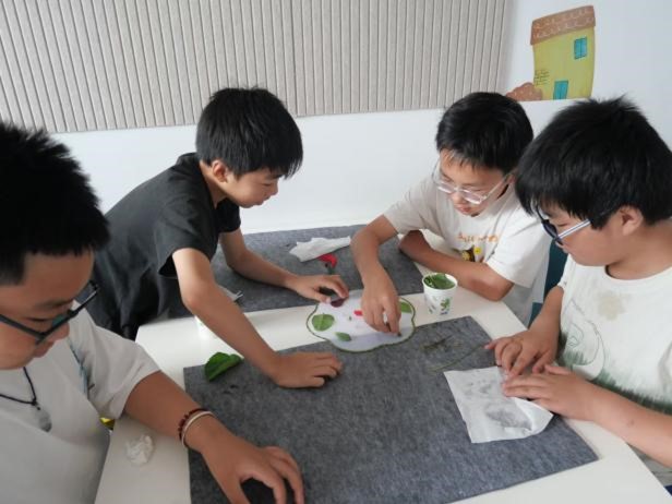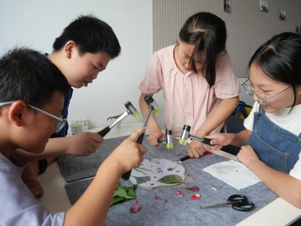 在课堂上,老师详细介绍了植物拓印的制作过程,并分发好提前浸泡过明矾的植物。在老师的指导下,学生们纷纷拿起工具,开始了自己的植物拓印创作。他们细心地挑选着各种植物材料,从树叶到花瓣,从草茎到果实,每一种植物都为他们提供了无尽的创作灵感。