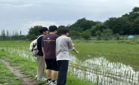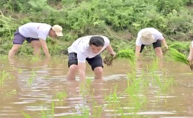 图为团队成员参观水稻田 图为团队成员在稻田里插秧