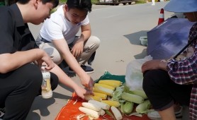 图为记录农村老人农耕故事 图为团队成员帮助农民卖粮