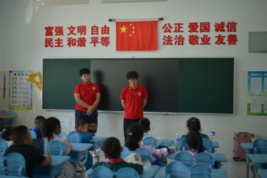 在音乐主题的课堂上,实践团成员向孩子们讲授《国际歌》《打靶归来》等歌曲,通过对歌曲创作背景的介绍,引发孩子们积极思考、踊跃发言,并让孩子们了解到歌曲创作背后波澜壮阔的历史。从识记歌词到跟唱简谱,从熟悉节拍到完整演绎,实践团成员的爱心、恒心与稚嫩的童心交织,让昂扬的红色歌声从这所蒙语小学教室里传出来,让革命精神与价值观深深植入学生们的脑海,帮助他们树立正确的道德观念,规范自身的行为,从而提高学生们的综合素质。