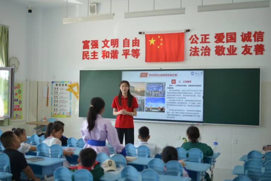 挺膺担当新时代,心手相牵向未来。这一系列活动中,饱含着支教团成员对孩子们在知识的田野里饱尝丰硕的果实、绘就希望蓝图的美好愿景。此次推普支教活动,进一步激发了孩子们学习普通话的兴趣和热情,增强了孩子们的文化自信心和民族自豪感,见证了文化的交融和梦想的起航,共同谱写了新时代民族团结和语言传承的新篇章。未来,实践团成员将持续致力于推普支教活动,为中华文化传承发展注入青春力量。