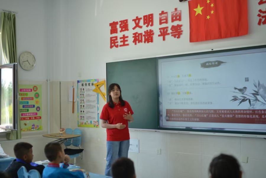 实践团成员从多样角度出发,为孩子们带来了一场又一场别开生面的精彩课堂。在“毛泽东诗词解读”主题课堂上,实践团成员重点解读了《沁园春·长沙》,从词作的背景进行切入,深入详细地为孩子们讲解了词作的结构内容与其中蕴含的革命情感,启发孩子们以天下为己任,立大志、明大德、担大任,成长为德智体美劳全面发展的时代新人;在“思想教育”主题课堂上,实践团成员围绕思想主题教育的主要内容,从故事教育、现实教育两方面切入,通过鼓励孩子们踊跃讲讲自己从实践中获取的经验教训,以问题为导向促进孩子们深入思考学习与实践之间的联动辩证关系;在“政治教育”主题课堂上,实践团成员立足“筑牢中华民族共同体意识”的主题,深入浅出地向孩子们解释了中华民族共同体的内涵与意义,孩子们争相发言,稚嫩的童音道出对祖国统一、民族团结深深的认同与期盼。