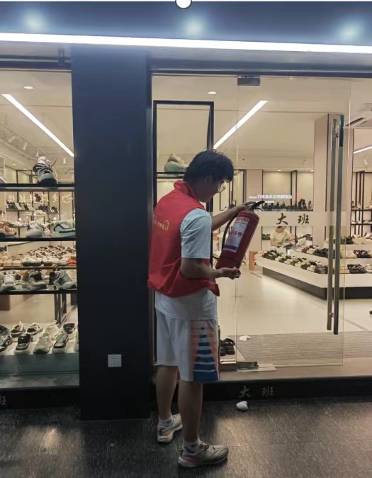 通过积极与社区党支部交流对接,在对社区的大体情况与相关问题进行初步了解后,团队成员决定通过以夜巡的方式来开展活动。在瓯北义警和党员的带领下,金瑞开同学在双塔路、金桂花小区等多地进行巡逻,向店家科普消防相关知识,并向其展示灭火器的使用相关技能,为维护社区用火用电安全贡献一份自己的力量。