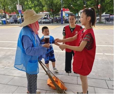 接着,为表达对劳动者的尊敬与感激,工作人员带领“小志愿者们”深入社区,为坚守在烈日下工作的保洁阿姨们送上自制的爱心饮料。在活动中向他们传达劳动光荣意识及志愿服务精神,提高青少年的孝老敬亲及感恩意识。