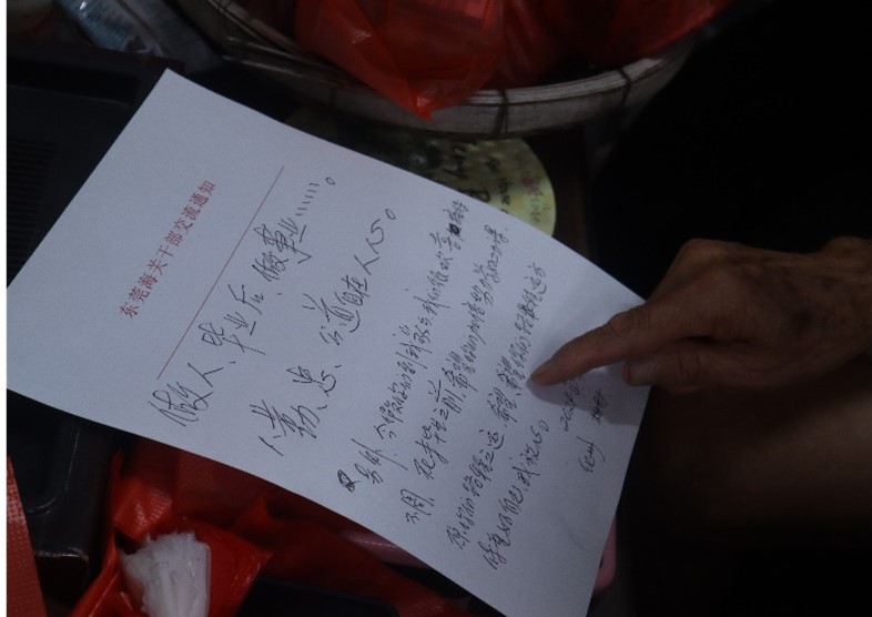 到桃姐与父亲家中做客时,知薪实践队开启直播与桃姐开展了访谈,深入了解帮助宣传其父亲的故事和五香粉的传统工艺,直播反响热烈,得到了桃姐与叶胜均爷爷一致夸赞。叶胜均爷爷张罗了一围化州特色菜招待我们,以白斩鸡为主菜,炒菜声、刀与砧板的撞击声引出围坐的欢声笑语,热闹又亲切。知薪青年离开时,叶爷爷拿出一张纸,颤颤巍巍写下对我们温暖而富有深意的期盼,为大家准备了近乎全国闻名的化州当地特色产品——化橘红(叶胜均60周年大寿纪念版)。