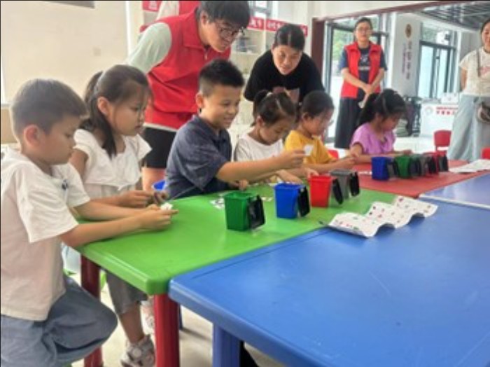 垃圾分类进社区,环境保护润童心。宣讲团成员首先向小朋友们详细介绍了垃圾分类的原则与方法,现场组织大家用物品卡片和四色分类垃圾桶模型进行垃圾分类。当小朋友面对“瓦片”“玻璃”等垃圾,不知如何分类时,宣讲团成员对小朋友的疑惑进行了耐心解答,并向小朋友们详细讲解了垃圾分类的意义、垃圾不分类的危害以及如何正确分类垃圾等。随后,宣讲团成员给小朋友们宣讲了人类和自然环境的关系,并给他们播放了微课视频,带领他们进一步了解人类与自然环境和谐共生的重要性,并通过提问抢答的方式充分调动小朋友们的积极性,引导小朋友们思考导致当前环境问题的原因,鼓励小朋友们认真学习垃圾分类知识,为环境保护贡献自己的一份力量。