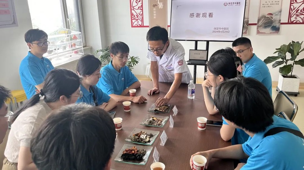 在健康宣教室,保定市中药调剂职业技能竞赛一等奖获得者李永辉为实践团成员展示了医院自主研制的中药代茶饮。从防流感代茶饮到降血脂代茶饮,成员们近距离观察并学习了中药材的辨识特点与功效。李永辉老师不仅介绍了茶饮的制作过程与功效,还现场泡制,让成员们亲身体验了中药代茶饮的草本香气与独特口感。在品茶的过程中,实践团成员不仅感受到了中医药在日常保健中的独特作用,更对中医药文化产生了更加浓厚的兴趣。