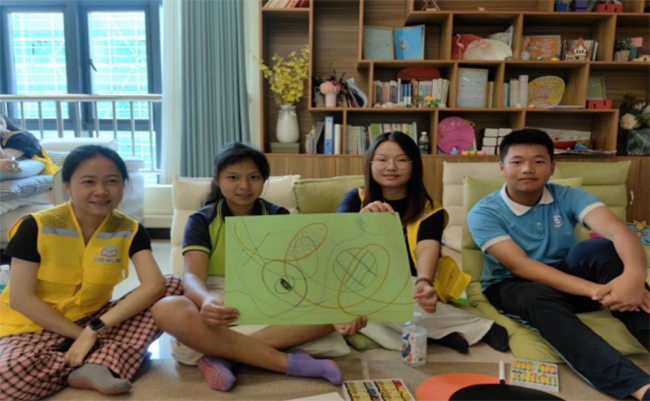 (图为青少年们与团队成员相互协作完成绘画活动 贺于桐 供图)