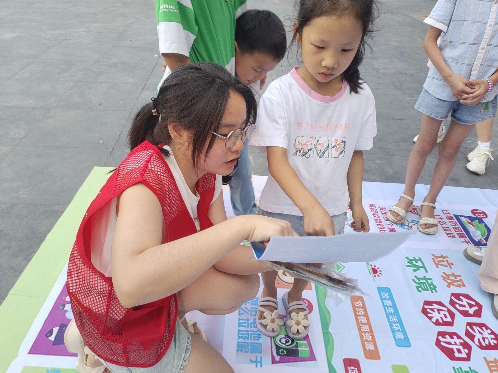 图为志愿者为小朋友讲解垃圾分类小知识。