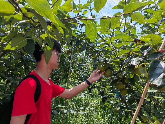 队员张子纯走入丹丹梨实践基地体验采摘