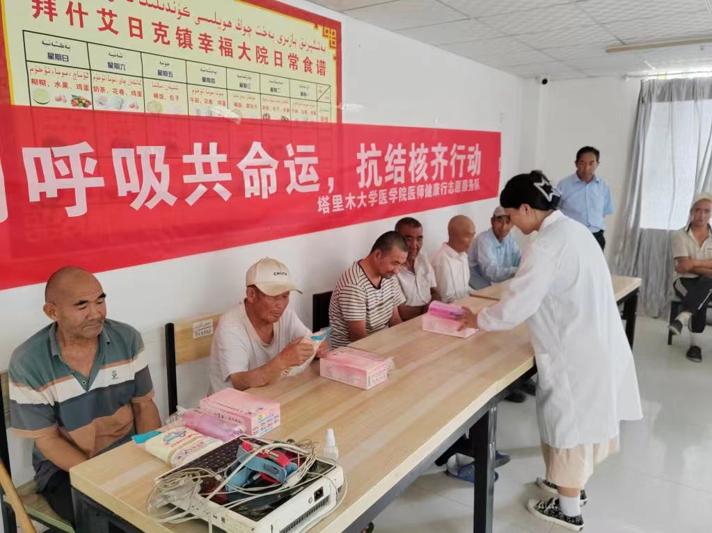 为弘扬中华民族尊老爱幼的传统美德,7月5日,塔里木大学医师健康行志愿服务队队员在拜什艾日克镇卫生院专业医生的带领下来到镇上的日间照料中心为老人们进行医疗知识科普宣讲,血糖血压测量,以及礼品发放活动。