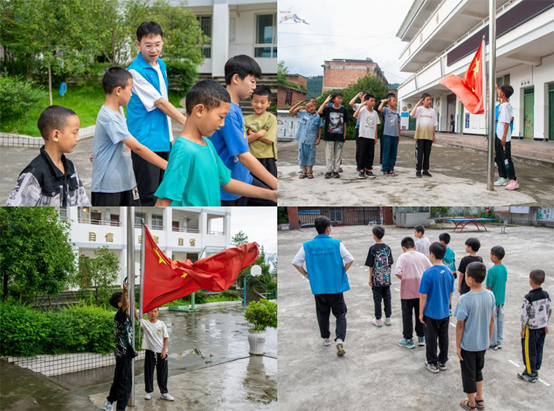 爱国教育是夏令营设计不可分割的一部分。大课间,操场上满是孩子们的欢声笑语,但有一群孩子却没有参与大家的游戏,而是在太阳下一次又一次挥动手臂,训练齐步、敬礼,他们便是国旗护卫队。孩子们站立于阳光下,汗水顺着脸颊滑落,却丝毫未减眼中的清澈与坚定。伴随国歌奏响,五星红旗在蓝天白云下缓缓升起,这是偏远穷困的山区最庄严肃穆的升旗仪式。这一刻,时间仿佛被赋予了特殊的意义,成为队员与孩子们心中永恒的记忆。