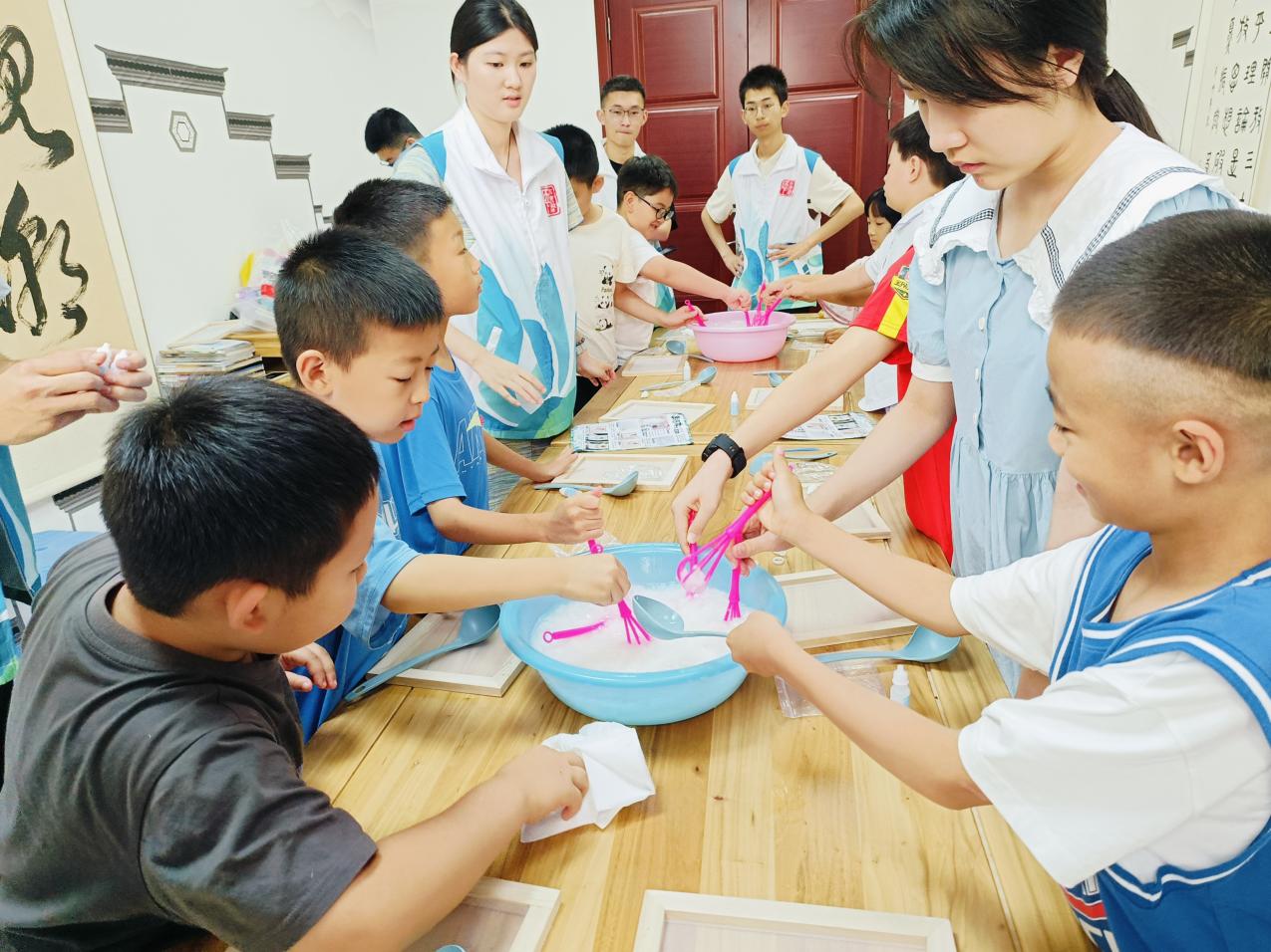 在进行科普宣讲之后,“希望小屋·童心绘梦园”社会实践团成员带领小朋友们亲自参与造纸术的制作。首先小朋友们将纸浆放入水中,共同用搅拌器将纸浆搅拌均匀。然后用网格进行抄纸,用干花、薄纸等在上面进行装饰,大家发挥自己的想象力,创作出了各种各样美丽的图案。接着在上面进行盖浆后进行晾晒。每位小朋友们都制造出了一张独属于自己的纸张,在动手操作中体验中国古人的智慧以及中华优秀传统文化的独特魅力,也感受着团队协作的快乐。
