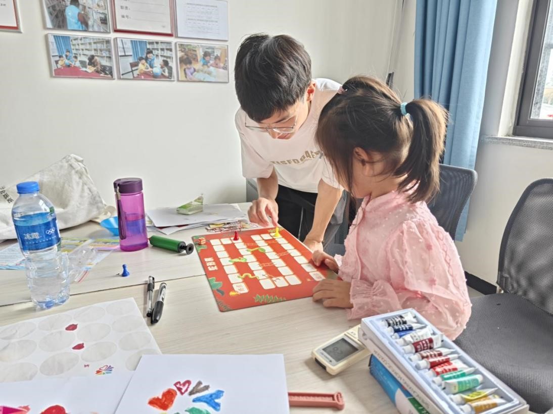 图为志愿者与孩子们玩飞行棋。丁静怡 供图。