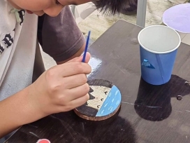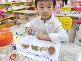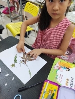 李昀同学带领小朋友们用植物叶片或花草标本进行艺术创作,并完成自己的贴画作品,通过教学与实践相结合的方式,既向小朋友们传输了理论知识又增强了课堂的趣味性,以手眼结合的方式完成了教学任务。