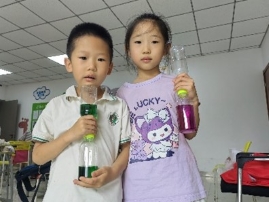 李婉慧同学带领小朋友们动手做龙卷风的小实验,并讲解其中的科学原理,丰富小朋友们的科学知识,培养科研兴趣。李婉慧同学还向小朋友们讲解自制灭火器的实验原理,并带领小朋友们亲手制作,培养小朋友们的动手能力。
