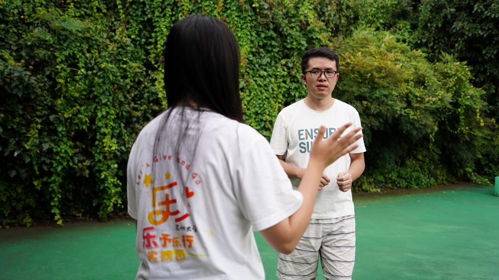 图为负责人刘馨怡正在采访中科院的一位博士。 通讯员刘子琦 摄