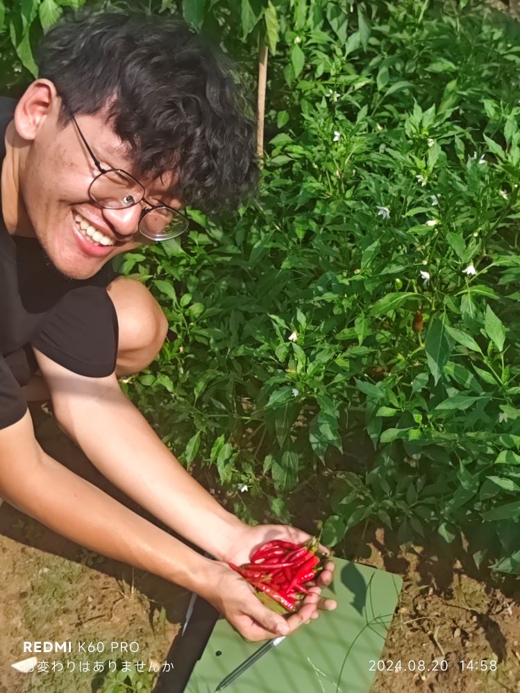 在调研过程中,小潘得知村里有一位老人在田间采摘辣椒时感到身体不适,立即前往探望。得知老人有些体力不支后,小潘主动提出帮忙,陪同老人一起完成了辣椒的采摘工作。这一暖心之举不仅解决了老人的燃眉之急,也让村民们感受到了来自大学生的关爱和温暖。