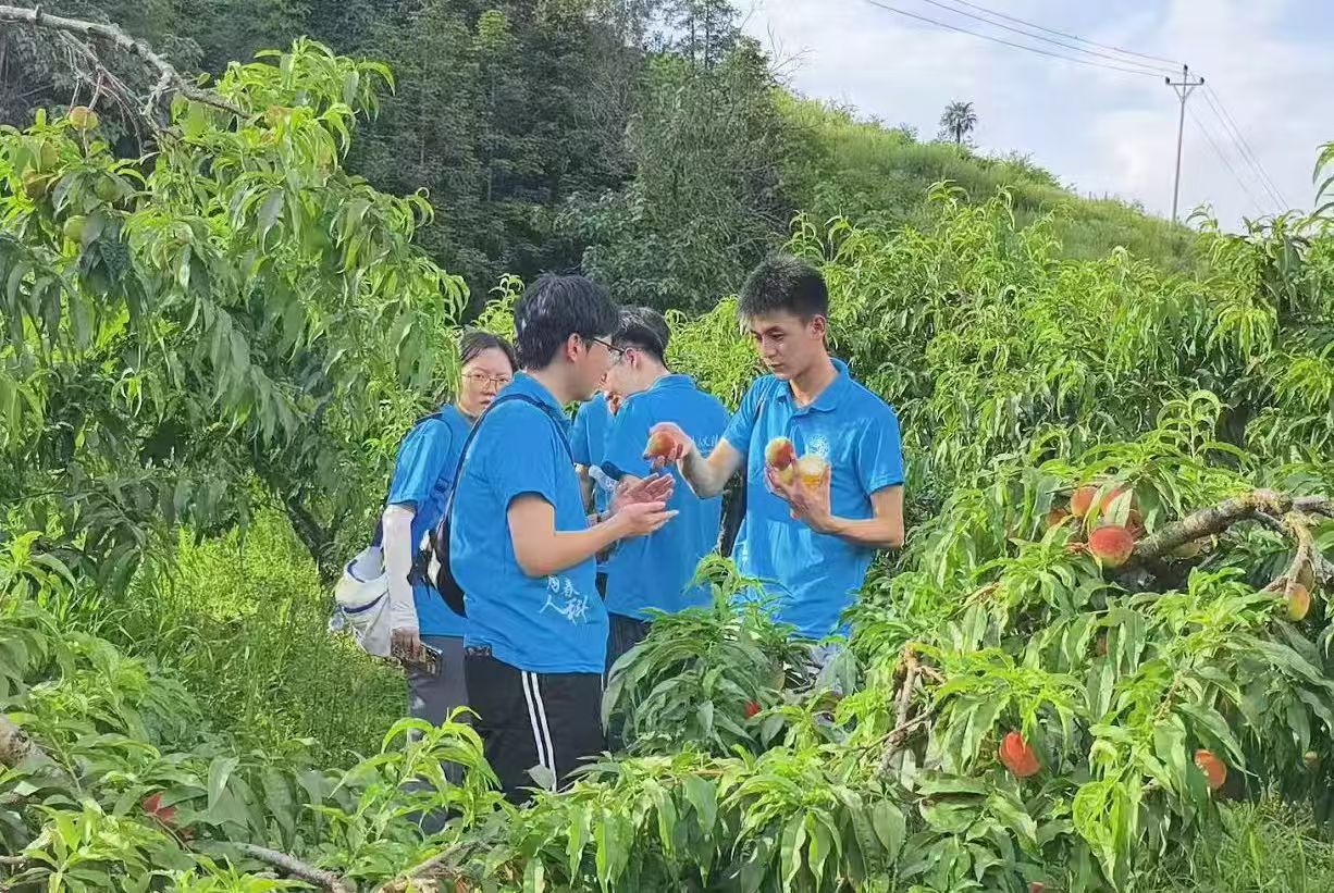 果园位于乡村腹地中,四周绿树成荫,空气中弥漫着果实的香甜气息。成员们一踏入果园,就被眼前满树挂果的景象所吸引。在果园负责人的引领下,实践团成员全面了解果园的运营现状,包括其种植面积、水果品种、病虫害防治手段以及市场销售模式。特别是当谈及果园的可持续发展理念时,负责人强调,他们始终坚持生态平衡原则,广泛采用有机肥料与生物防治技术,致力于生产绿色健康的果品,赢得了市场的广泛认可与好评。
