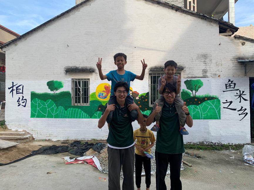 在绘制过程中,实践团成员们不畏烈日炎炎,不怕辛苦劳累。他们早出晚归,即使汗珠滚落脸颊,仍挥动着画笔,用心勾勒每一个线条,仔细填充每一种色彩;有的站在高高的爬梯上专注创作,有的跪在地上精心雕琢细节,汗水浸湿了衣衫,但他们的脸上未曾改变的是青春的热情与执着。在墙绘的过程中,都斛村的小朋友们也自发加入了实践团队,在用普通话与成员们沟通中,小朋友们也发挥了自己的想象力在墙面上留下了独特的印记。