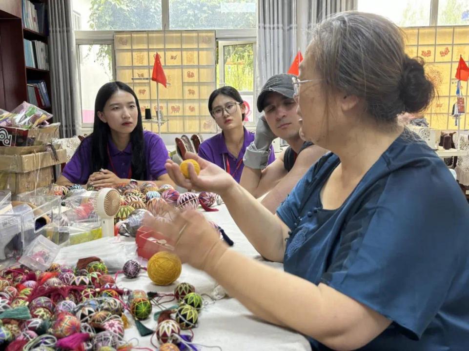 (图为中外学子认真学习非遗传承人刘亚明老师讲解的手鞠球制作技法 焦房喆摄)