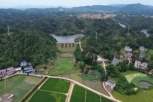(图为南田水库以及水稻种植区)