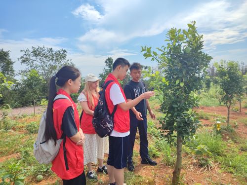 在排头乡合荣村党支部书记蔡治卫、枳壳基地负责人刘欢和其他村支部成员的带领下,实践团来到了枳壳种植基地进行参观调研。据了解,合荣村的枳壳基地自2023年开始种植,至今种植面积已有100多亩。因枳壳种植技术要求较低、价格浮动较小,合荣村从益阳引进成年树苗种植,定期修枝、施肥,并请湖南省农科院教授前来进行技术指导。