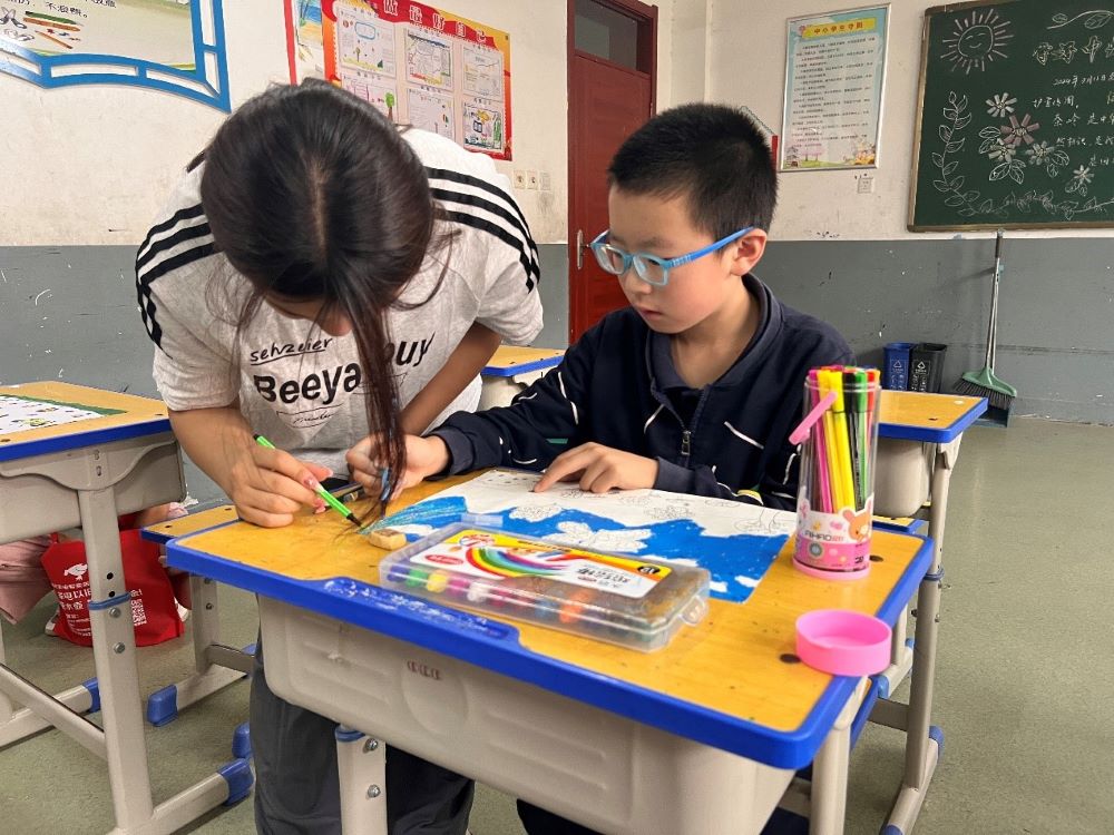 图为支教团成员在指学生画画。刘芳芳 供图