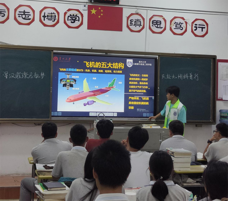 为普及航空航天知识,激发青少年对科学的兴趣,贵州大学大数据与信息工程学院“启航智行”团队于8月18日走进贵州省松桃民族中学,开展了一场生动有趣的航空航天知识宣讲活动。此次活动吸引了众多同学参与,气氛热烈,场面热情洋溢,展现了学生们对科学探索的浓厚兴趣。