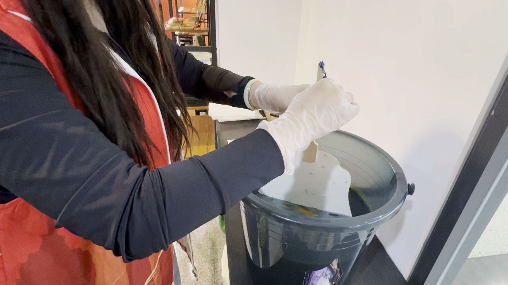 (图为实践队员进行漆扇染色 实践队员 魏思竹 供图)