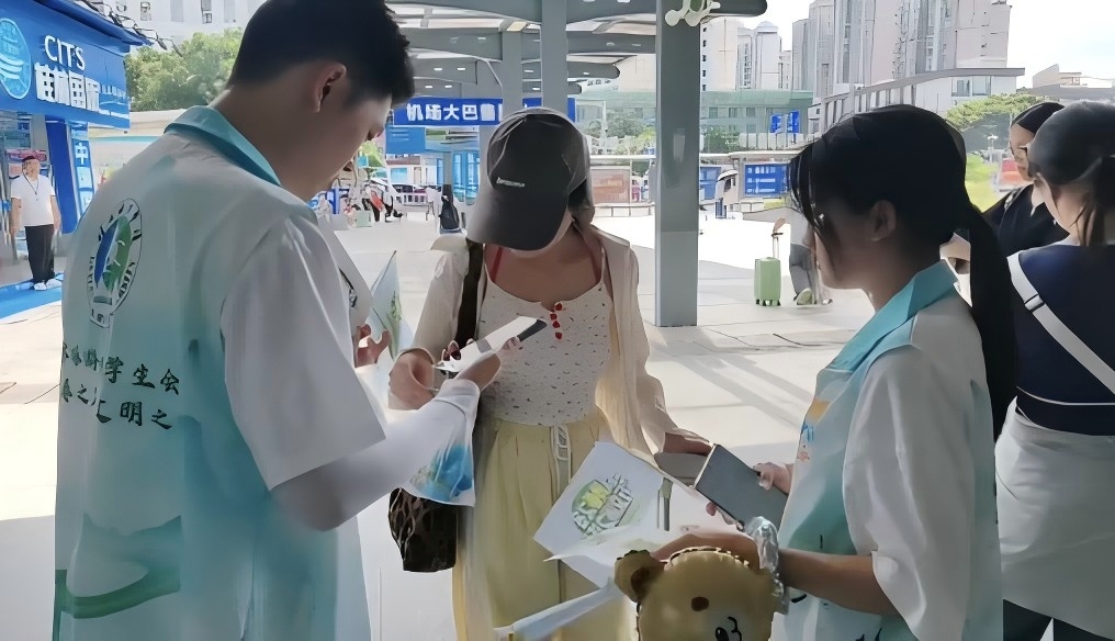 7月13日清晨,服务团成员们身着统一的宣传队服,分为两个小分队,分别在桂林站内外开展文明旅游宣传活动。站内小分队手持文明旅游宣传册,耐心细致地向过往旅客讲解车站规章制度和文明旅游的重要性,引导旅客文明候车、有序乘车。站外小分队则通过发放宣传资料、组织知识问答和签名活动,吸引了众多市民和游客的参与,现场气氛热烈而有序。