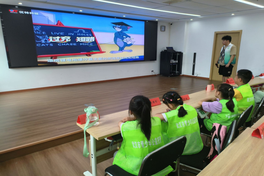 图为实践团通过播放视频让爱心托管班的孩子们了解锂电池爆炸的可能原因。李雯婕 供图