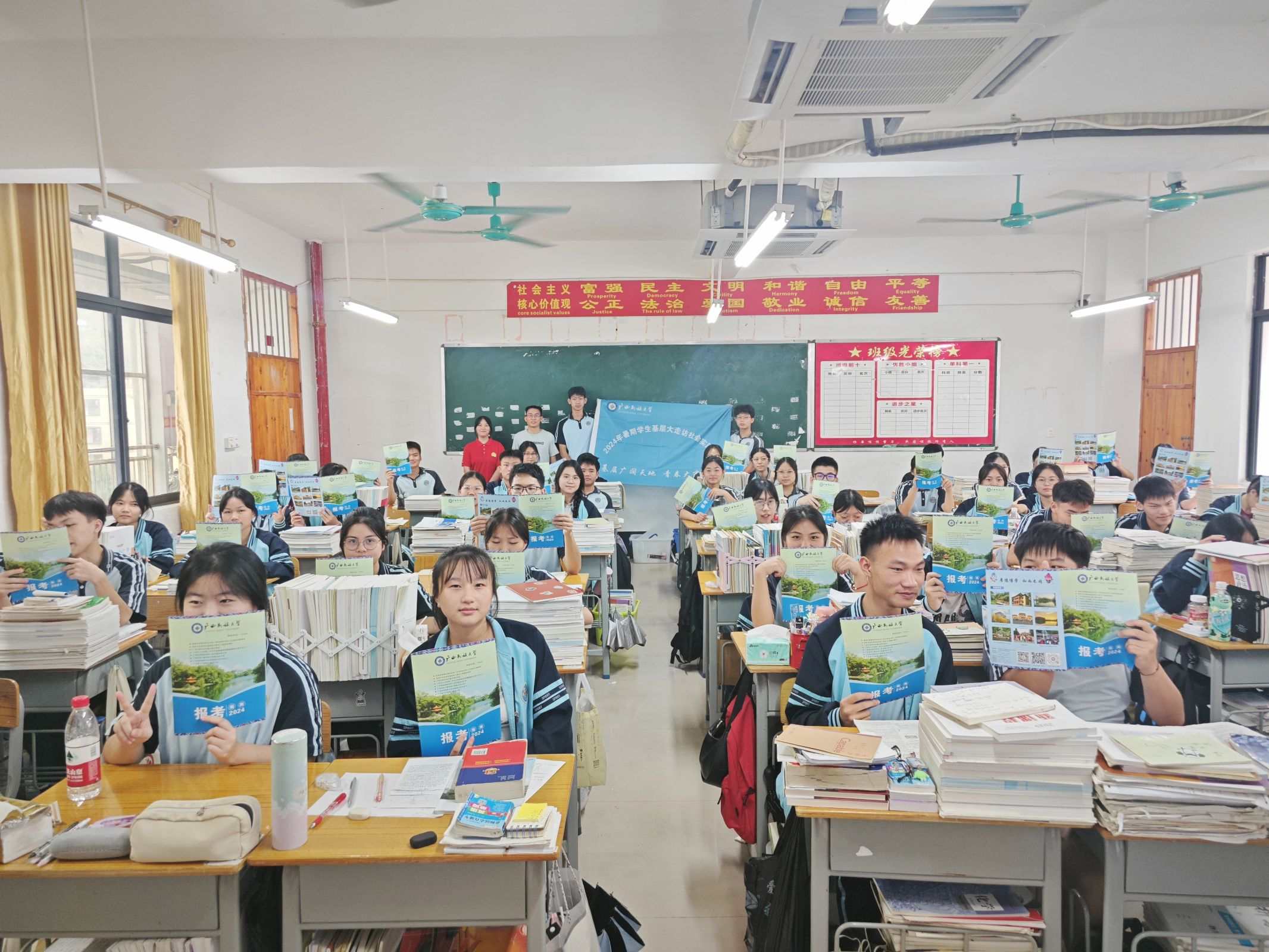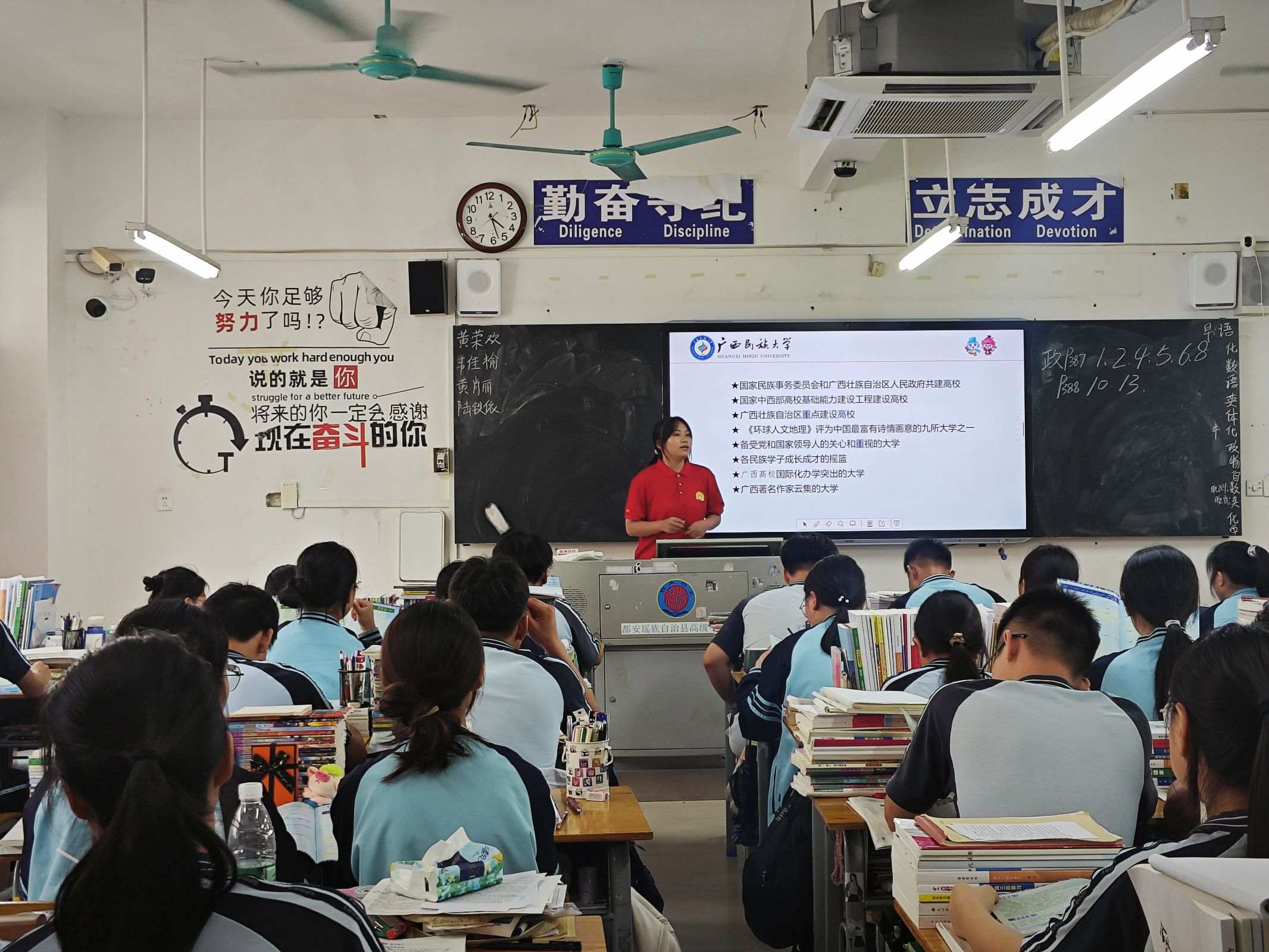 随后,我们与宣讲班级的班主任会面,在他的带领下我们顺利进入班级进行宣讲。在此过程中,我们提前准备了宣传材料和手册分发给学弟学妹们,以便他们提前了解广西民族大学的基本信息。