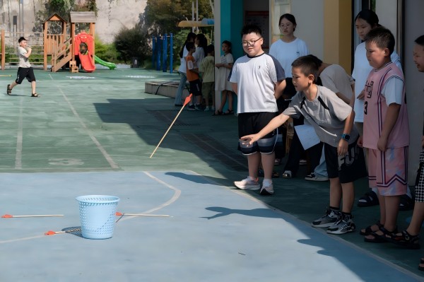 学生在投壶比赛中聚精会神的投出令箭