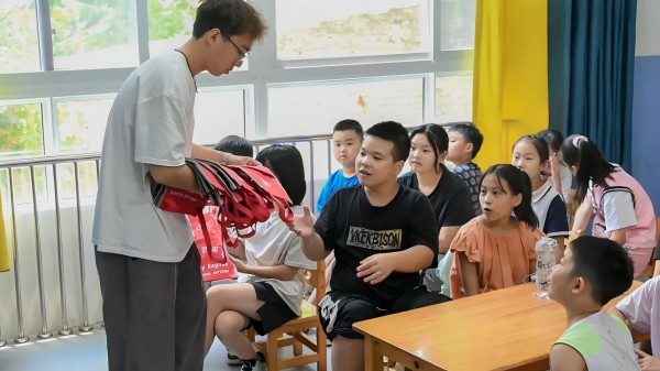 胡尧为同学们分发于发亮老师捐赠的书包