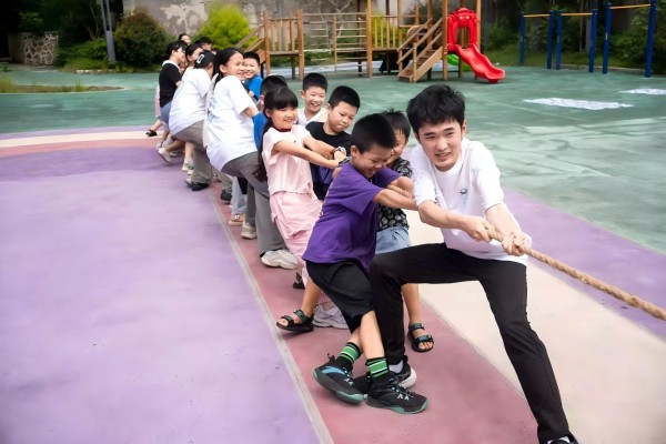 寓教于乐,身智并建。同学们在赛场上激烈追逐,尽情挥洒青春汗水,熠熠出彩,斗志昂扬。50m接力跑率先开场,同学们紧握接力棒,用尽全力摆臂,向着队友奔跑,被传递的不仅是接力棒,更是每一位参赛队员的团队精神与体育热情;“手脚并用”比赛中,参赛同学努力协调左脚右脚、左手右手,小心翼翼地踩对、摸对每一个图案,同学们一路过五关斩六将完成一个又一个高难度动作,以最快速度冲向终点;接递篮球比赛以班级为单位进行,赛前每支队伍积极讨论比赛策略,队内同学坐成一列,双手自前到后举过头顶,快速传递篮球,展现团结协作精神,争取为班级取得荣誉;“营救”队友比赛中,队首同学率先出发,向前奔跑并返回,随后牵住下一名同学的手,再一次出发,直到整个队伍一同冲过终点。参赛学生发挥出全部实力,将队友依次救出并一起冲向终点;投壶比赛里,同学们单手拿箭,屏气凝神,目光锁定箭筒,手腕发力、投出,一气呵成。大家拼运气、比技巧,一片欢声笑语,其乐融融。最后,神秘项目——拔河宣布开赛,校园内顿时欢腾起来,师生们如潮水涌向比赛场地,空旷的校园立刻沸腾起来,大家的双手早早握紧麻绳,蓄力待发。随着一声响亮的哨子,绳的两端同时发力,“一二,一二 ......”,师生们喊着整齐划一的号子,脚步随着号声一起向后迈,每个人都卯足劲,齐心协力向后拉,整个比赛场地人声鼎沸,热火朝天。随着拔河比赛的结束,充满互助协作、比赛竞技的第一届蜀光趣味运动会圆满落下帷幕,蜀光支教队成员们和底洞镇莘莘学子在比赛中展现出积极向上、团结协作的优良精神风貌。
