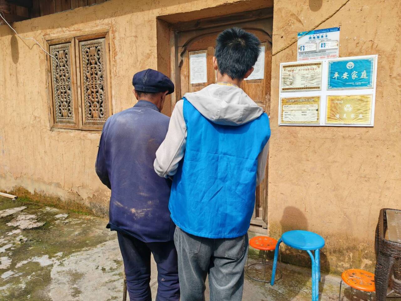 图为实践队员搀扶老人进屋