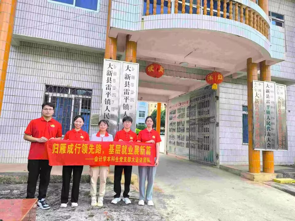 为深入贯彻党的二十大精神,引导广大青年学生走出校园,勇于到基层一线和艰苦边远地区建功立业,7月12日上午9:00,会计学本科生党支部大走访团队赴崇左市大新县雷平镇人民政府对基层就业的校友梁涣兰同志进行访谈学习,了解优秀校友扎根基层,服务人民的事迹。