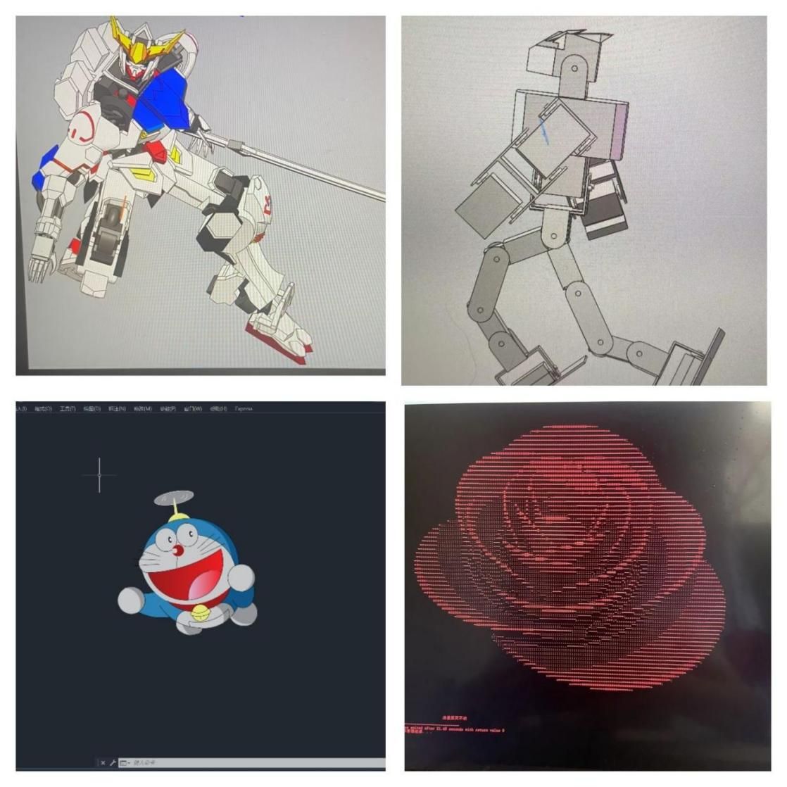 第二部分是通过使用C++、python、CAD等编程或画图软件,制作包括跳动的心脏、汽车模型、高达、动漫角色等有趣生动的作品。同学们在制作科技作品的同时逐渐熟悉了本专业所长,他们为了完成某个功能而投入软件的学习,真正的把学习带到了平常生活中。