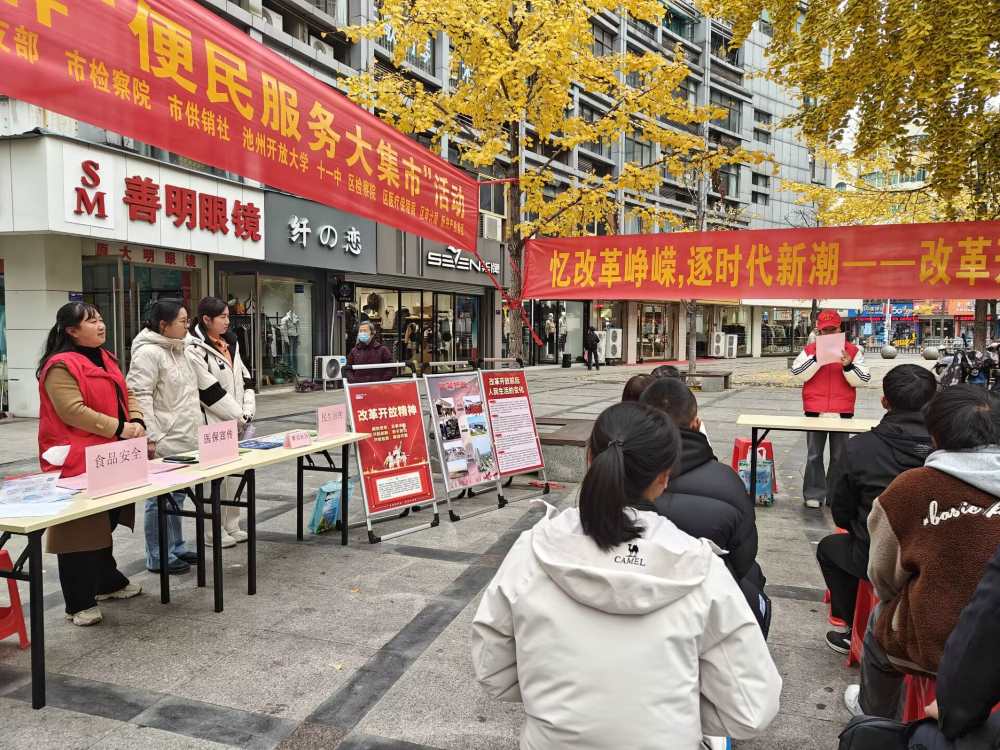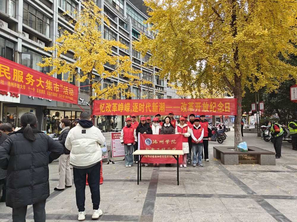 在2024年12月9日,池州学院机电工程学院23级电子信息科学与技术1班联合贵池区清风街道翠百社区、市十一中学、区检察院等共建单位在秋浦花园广场开展“忆改革峥嵘,逐时代新潮——改革开放纪念日”主题宣传活动。活动伊始,由班级负责人组织参与者于12月9日下午1:00在贵池区清风街道翠百社区集合,进行集合进行签到和活动说明。班级负责人由浅入深,由小到大地的讲述了改革开放的重要意义,改革开放如同一股强大的力量推动着社会不断向前发展,它不仅改变了国家的面貌,也改变了我们每一个人的生活。活动中期,班级负责人进行就改革开放为主题的宣讲,并邀请路人参与有奖问答。每个人都对改革开放带来的变化深有体会。活动后期,由班级负责人进行活动总结。参与的同学都万分感慨,我们从改革的峥嵘岁月中汲取了前行的动力,更加坚定了追逐时代新潮的信念。