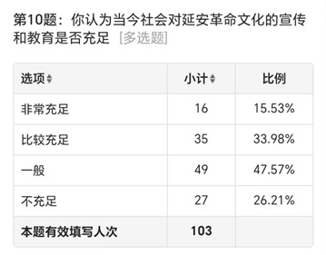 最后,对于当今社会对延安革命文化的宣传和教育是否充足的问题,高达47.57%的受访者表示一般,更有26.21%的人直言不充足,表示非常充足的受访者仅占15.53%。这反映出当今社会对于延安革命文化的宣传教育可能存在力度不够、缺乏吸引力等问题。