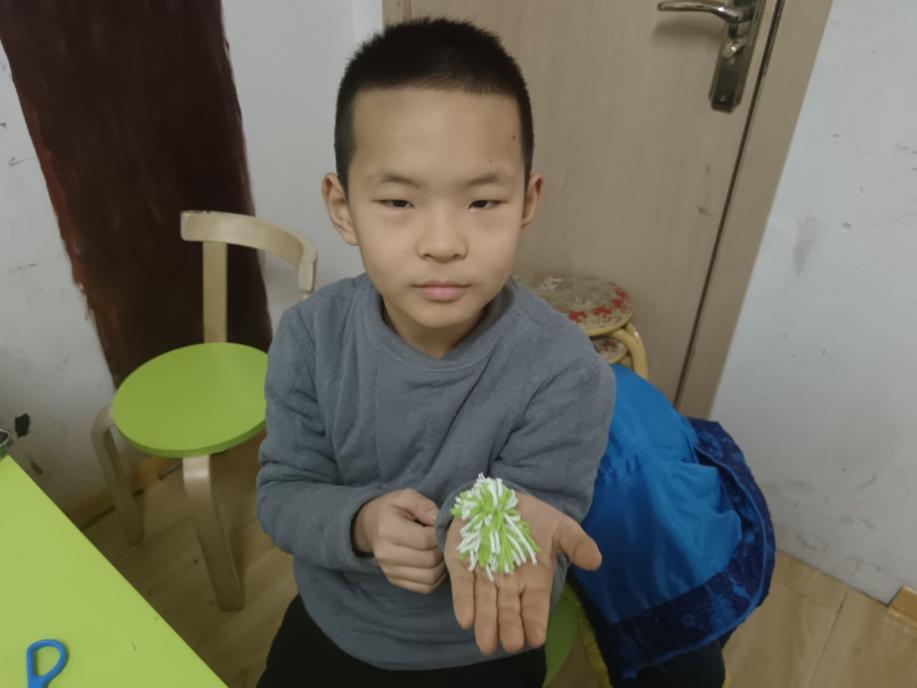 美术课上,创意无限。志愿者老师拿着制作好的毛线蒲公英成品,向小朋友们展示,孩子们的眼睛里闪烁着好奇与惊喜。在老师的一步步示范下,小朋友们拿起绿色和白色的毛线,认真地缠绕、粘贴,努力做出属于自己的精美作品。经过一番努力,一朵朵栩栩如生的毛线蒲公英在孩子们手中诞生,他们脸上洋溢着自豪的笑容。