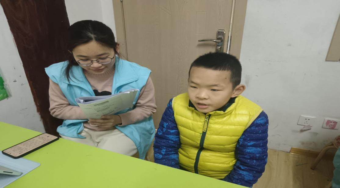 早读结束后,志愿者们化身为贴心的学习小助手,全神贯注地辅导小朋友们完成语文、数学和英语作业。小朋友们坐姿端正,小手紧握着笔,认真书写着每一个字、每一道题。每当小朋友完成一部分作业,志愿者们便仔细检查,用红笔轻轻圈出错误,然后温柔地为孩子们讲解,耐心地看着他们一笔一划地改正。