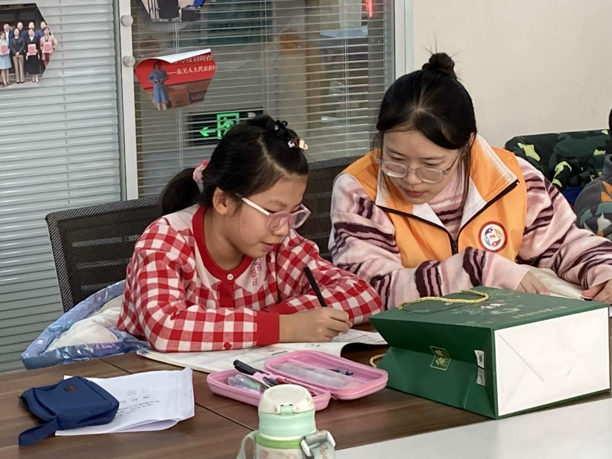 下午一点半,在简单的破冰游戏后,孩子们再次进入自习状态,由志愿者同学辅导完成课业。