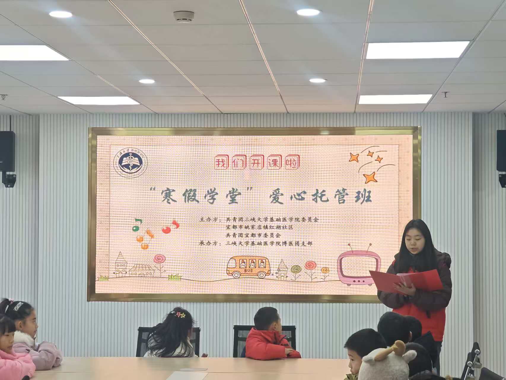 活动伊始,红湖社区负责人对参与本次“暑假学堂”爱心托管班活动的领导和三峡大学基础医学院的师生表达感谢和欢迎,简要介绍了寒假学堂的课程内容,让青少年初步了解了“寒假学堂”的意义。他表示,希望在市团委、社区干部、三峡大学及大学生志愿服务团队的助力下,将本次寒假学堂“爱心托管班”办好、办实、办出色,共同守护每一个少年儿童健康成长。