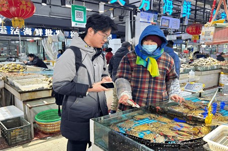(图为实践队员向摊主了解海鲜销售情况。程文阳供图。)