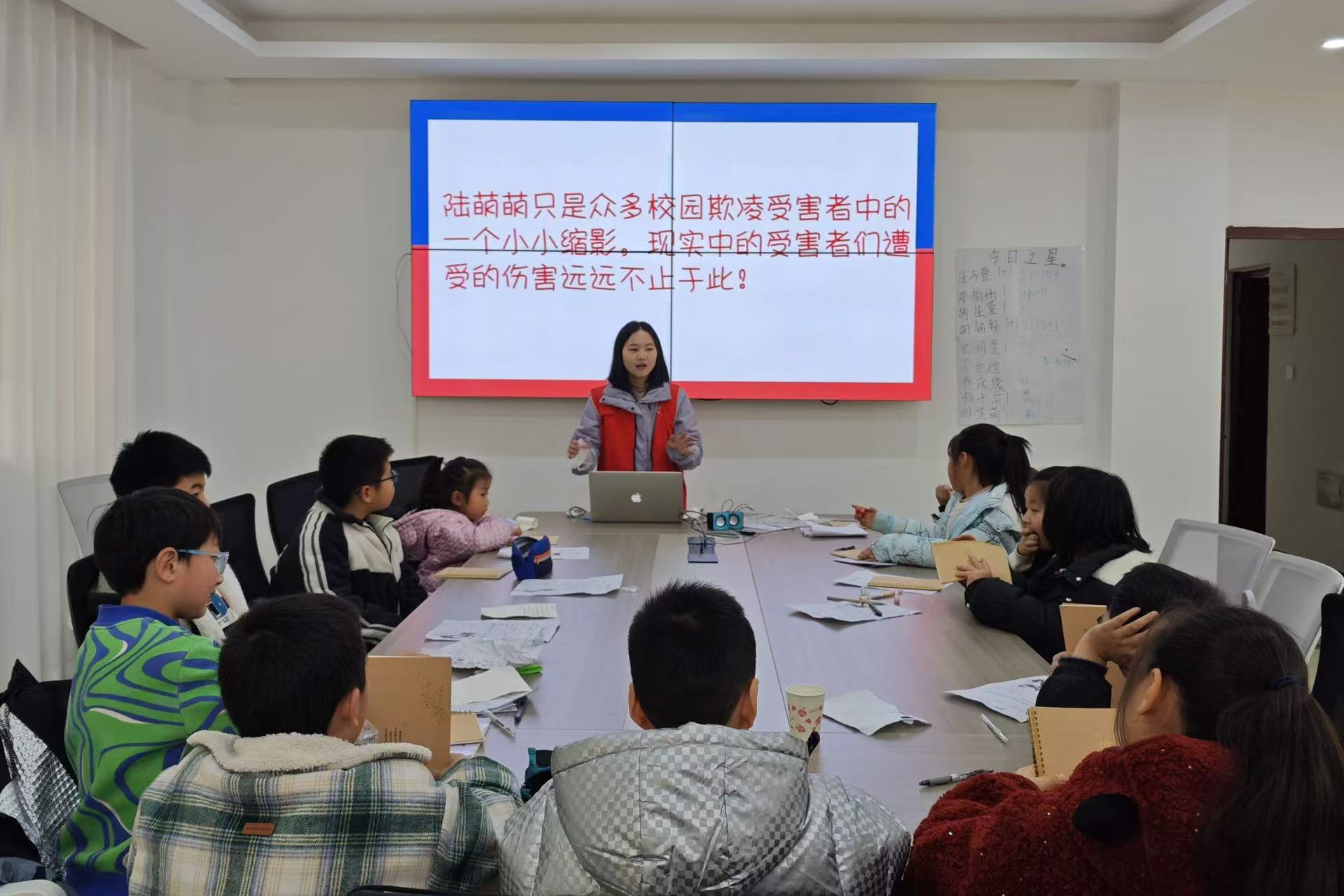 随后,沉浸式剧本游戏牢牢吸引学生目光,孩子们化身侦探,在不同场景中穿梭寻觅线索,历经一个半小时的推理,成功揭开真相。活动后,孩子们纷纷表达对受害者的同情,深刻理解了霸凌的含义。
